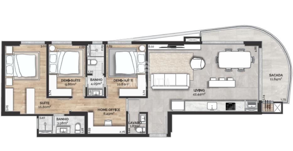 130,22m² privativos com 3 dormitórios.Pé direito com 2,55 metros de altura.