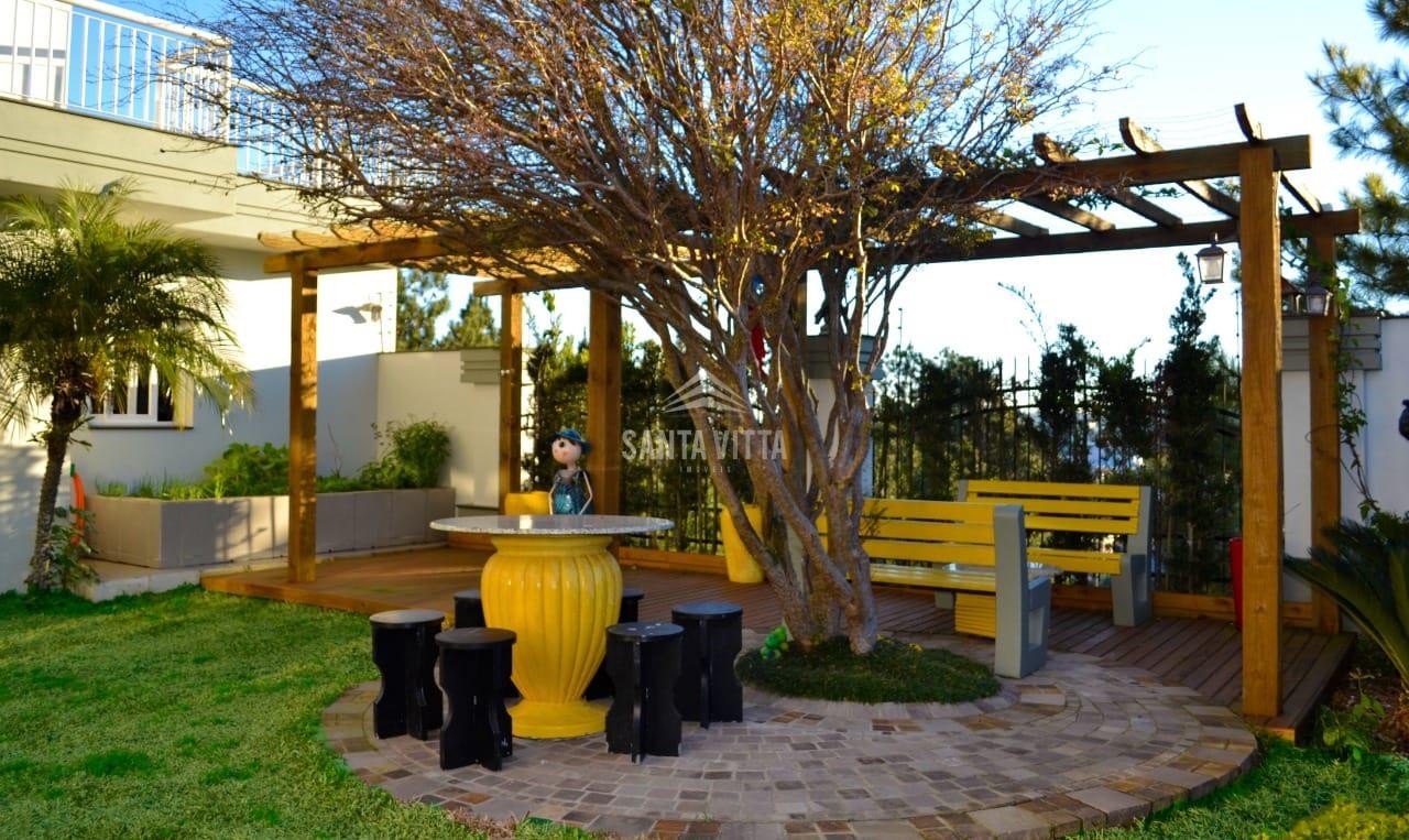 Jardim todo gramado com pergolado e horta;