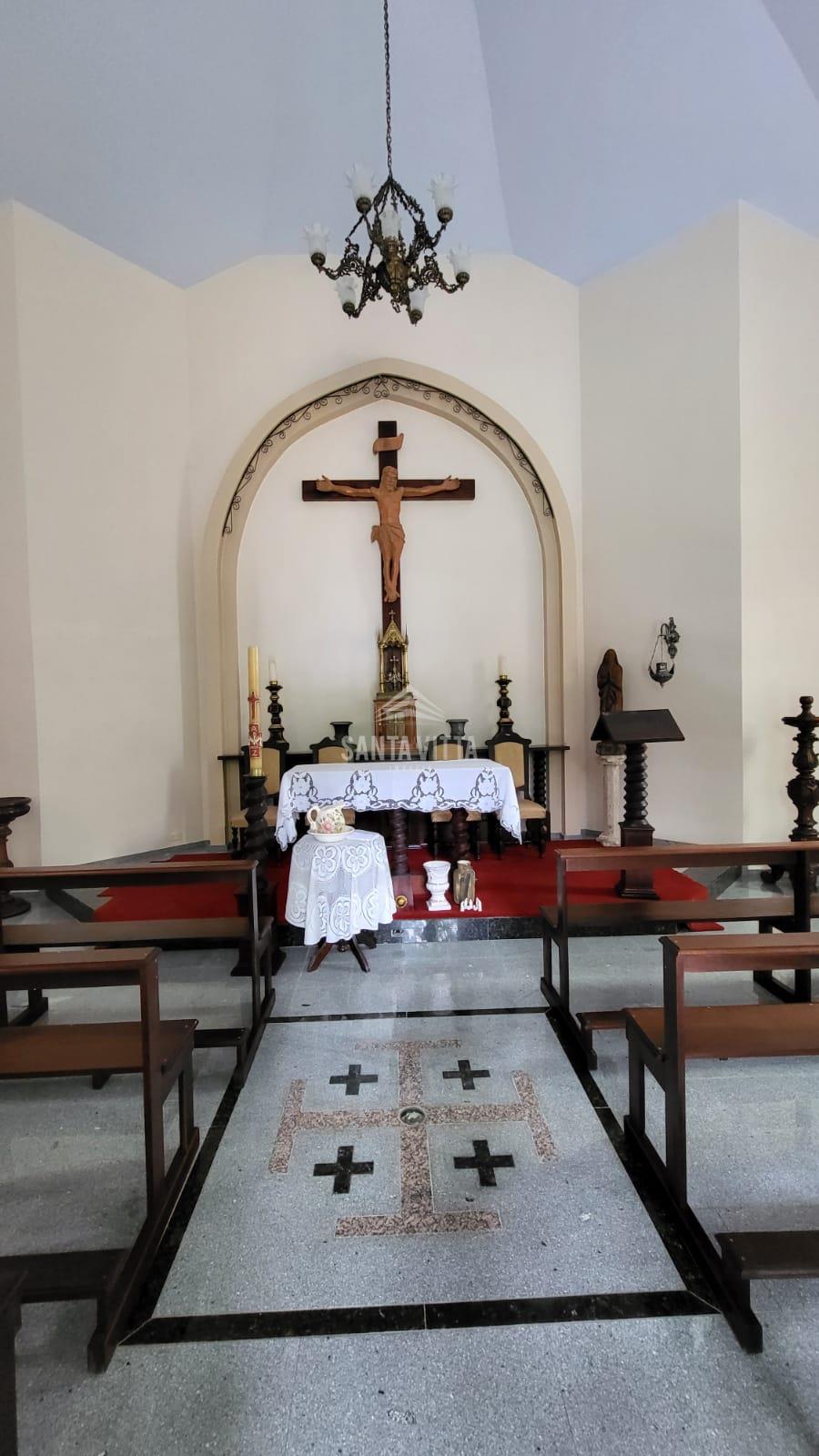 Igreja com altar e bancos;